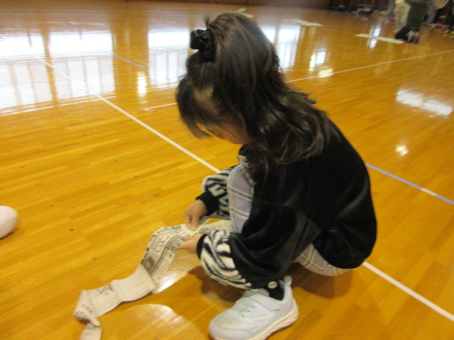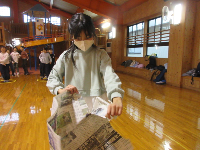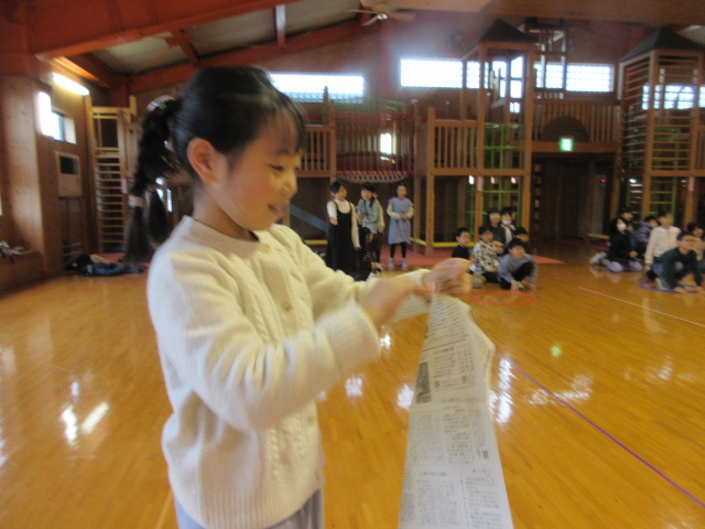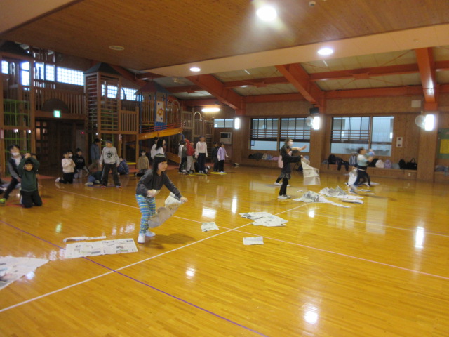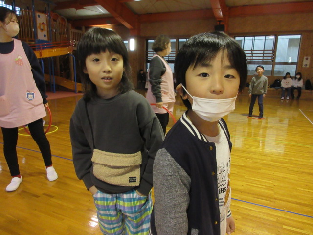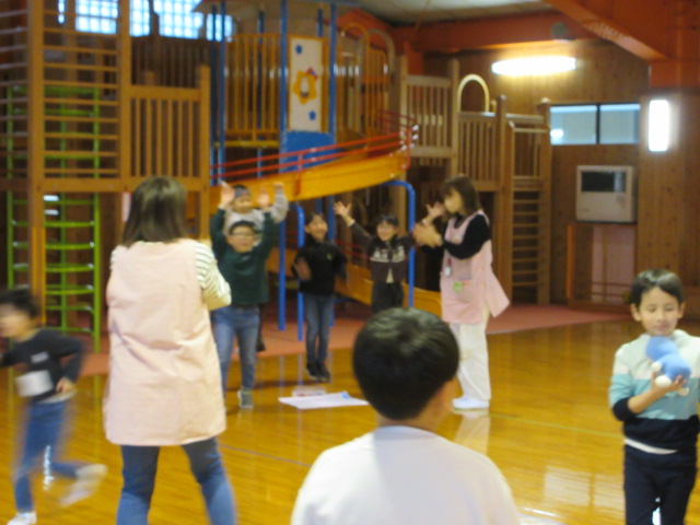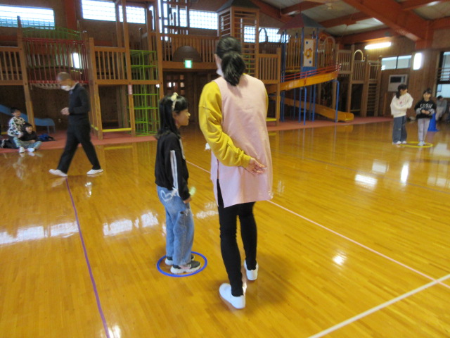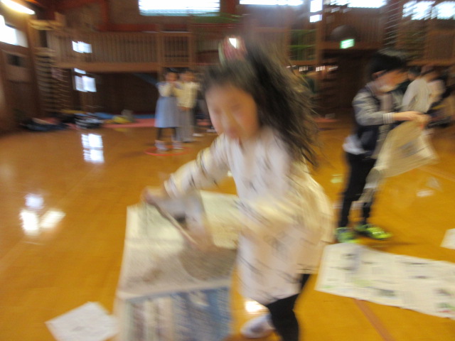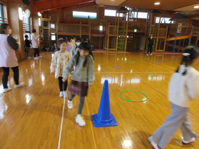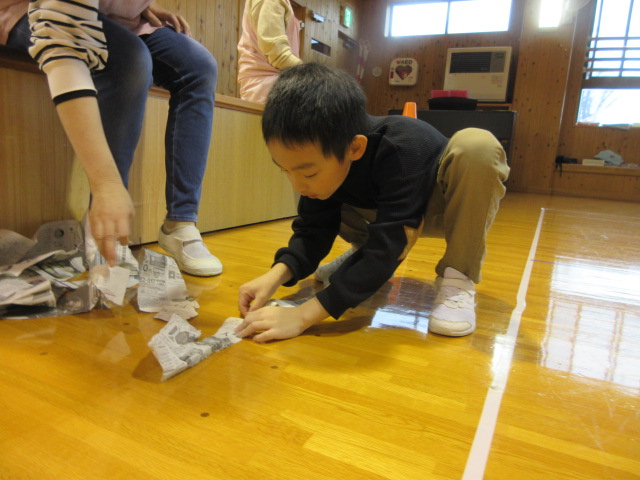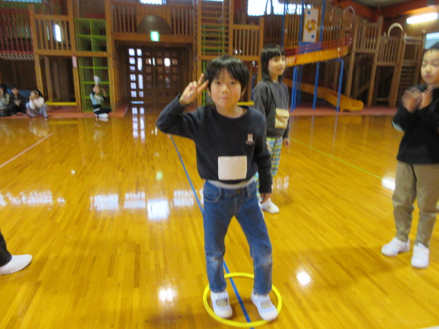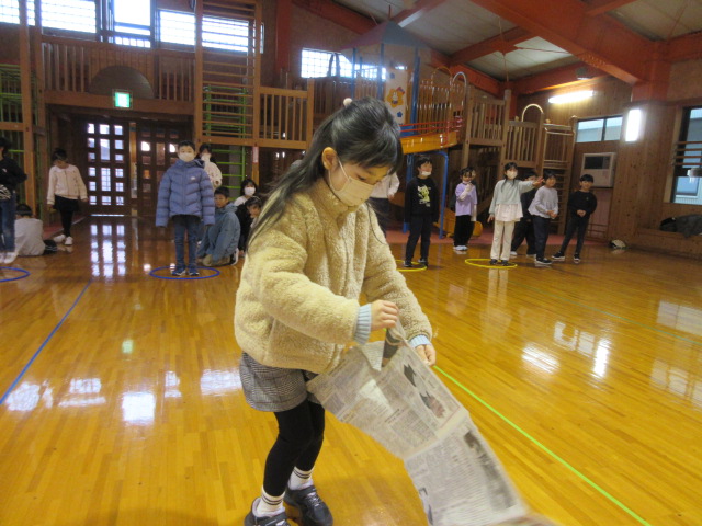 フープ取り、新聞つなげレース、幼稚園の思い出ビンゴを楽しみました。