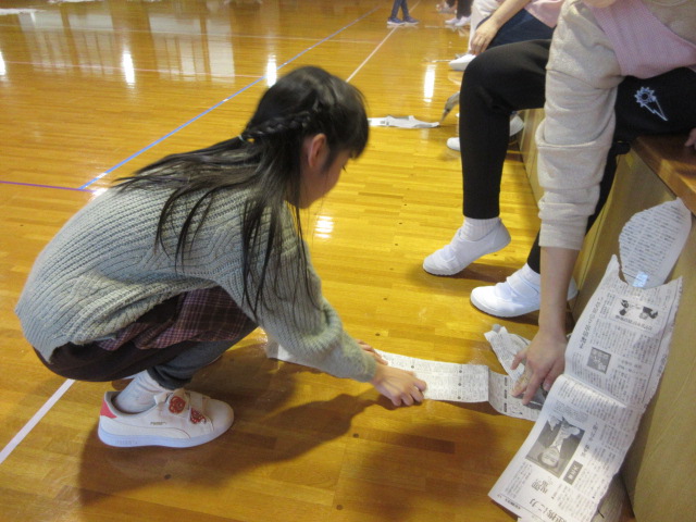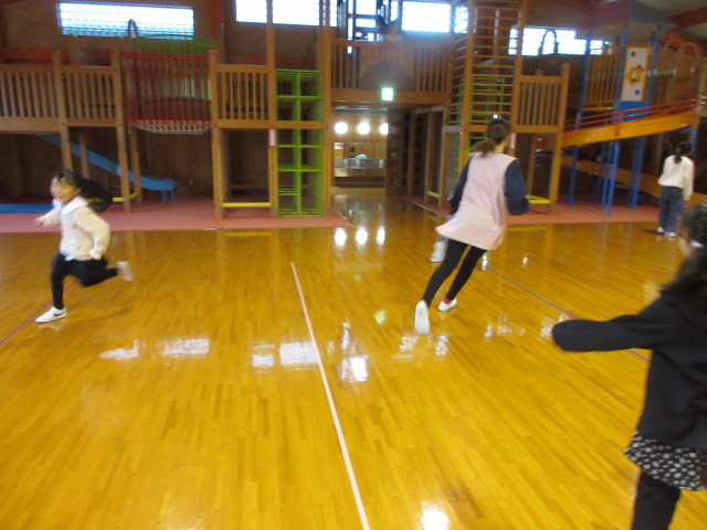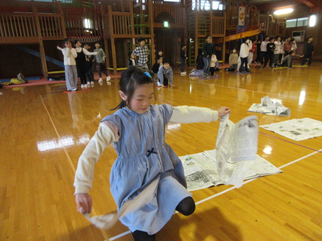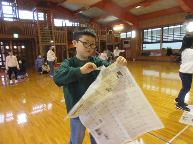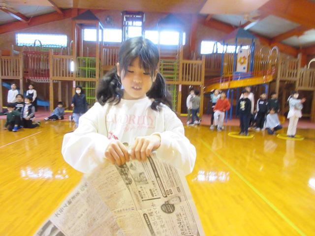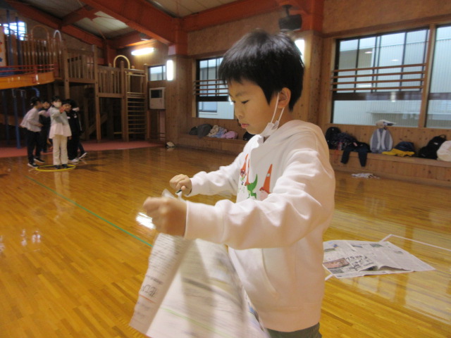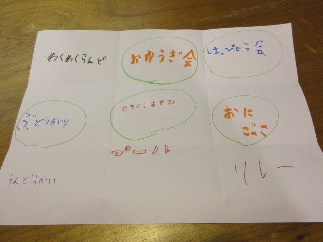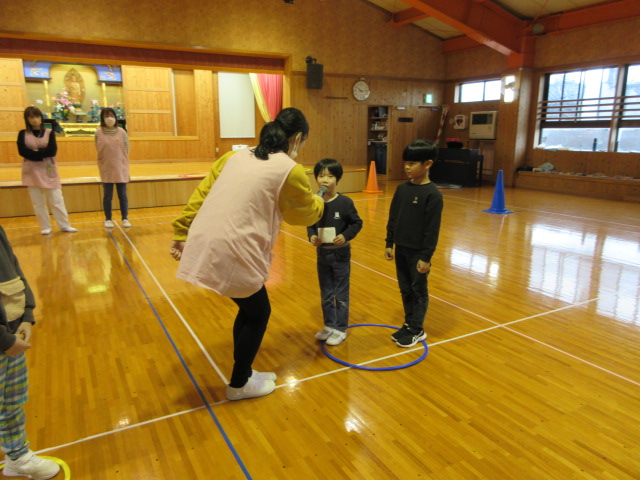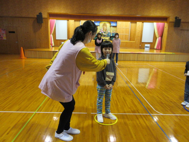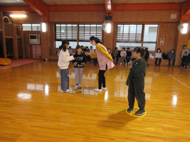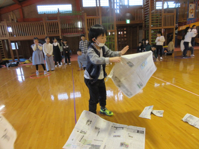 フープ取り、新聞つなげレース、幼稚園の思い出ビンゴを楽しみました。